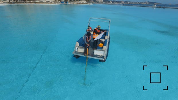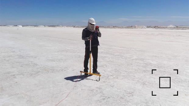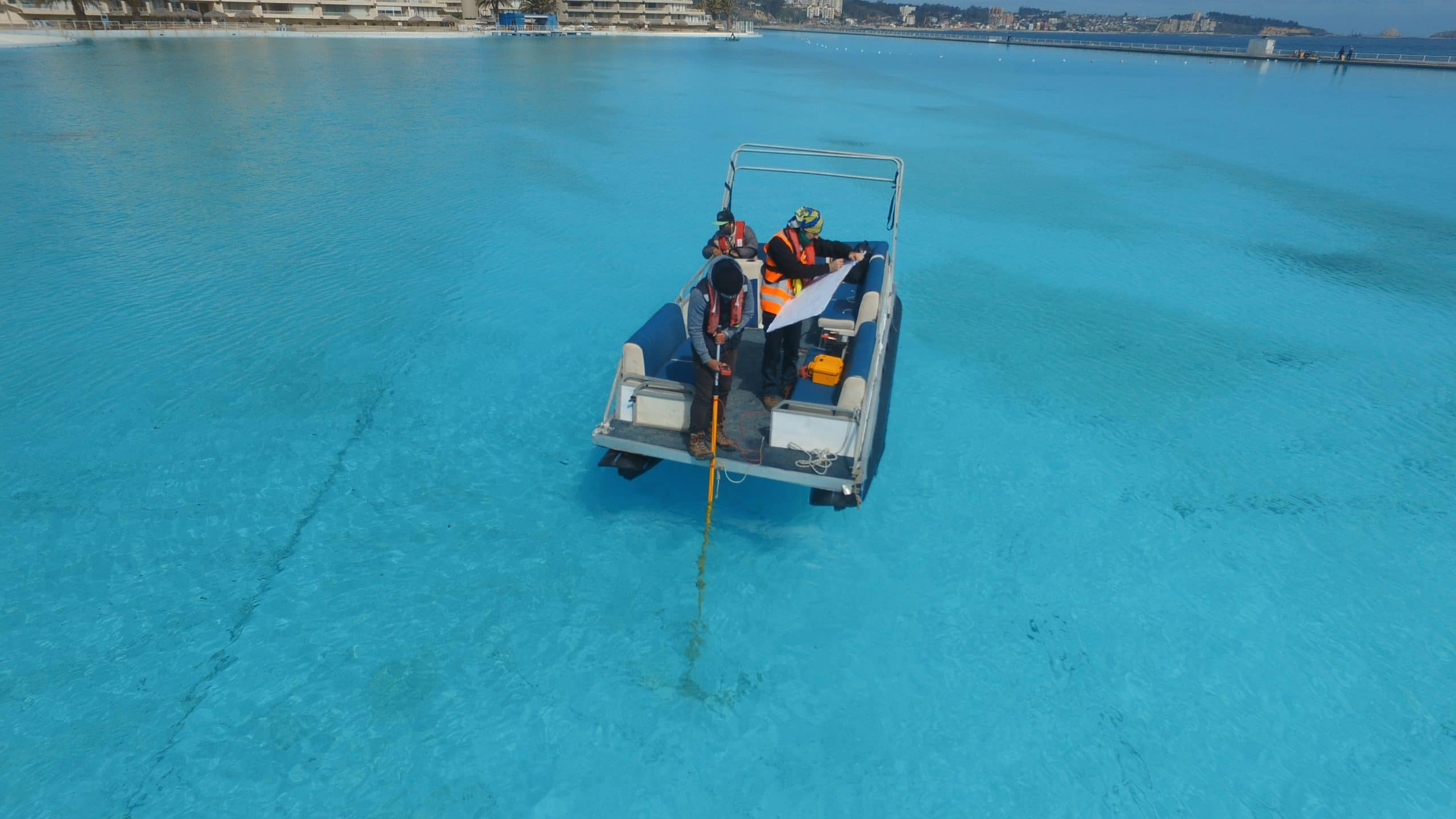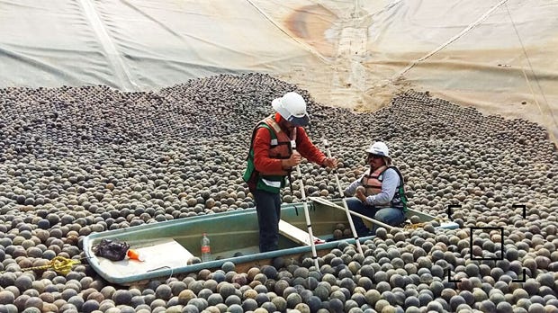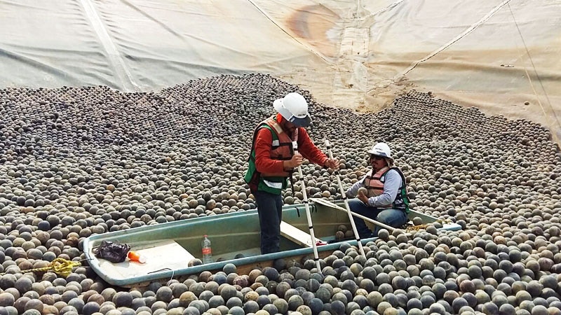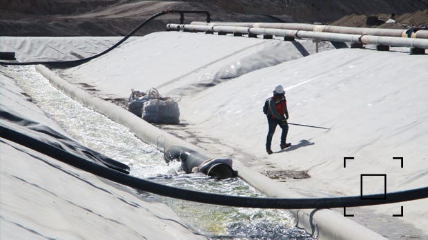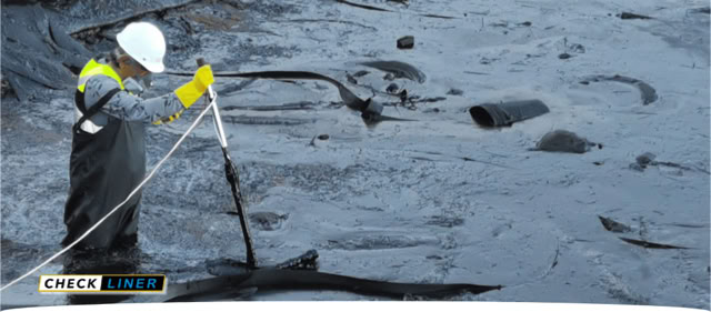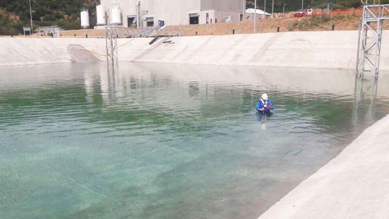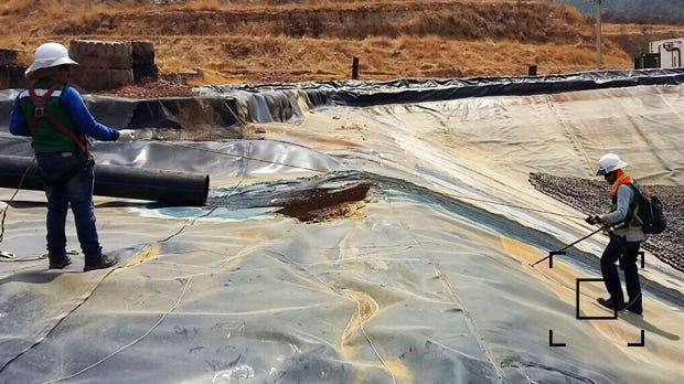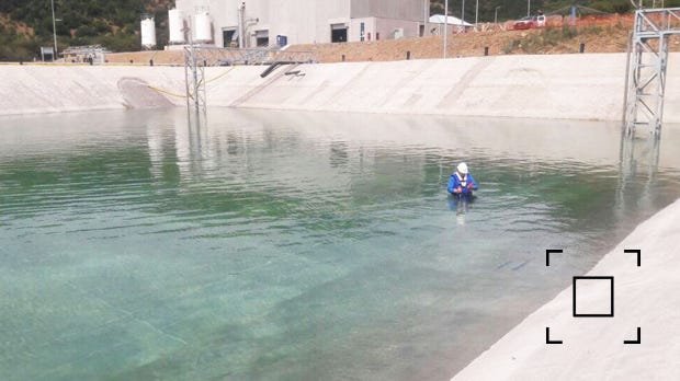 Inspección de fugas y daños en geosintéticos cubiertos por ejemplo bajo mineral, solución ácida, canales de lixiviación, repertorios de agua, rellenos sanitarios.